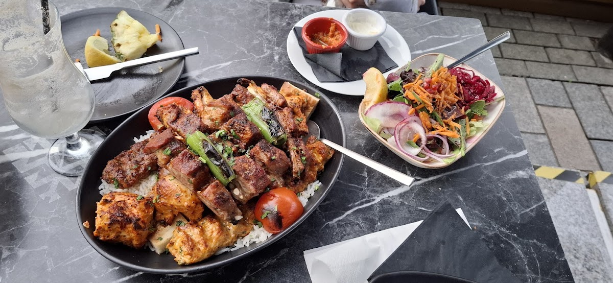For those who love grilling, the Yogurtlu Tavuk Shish (grilled chicken skewers with yogurt) and Lamb Shish Kebab are just the right choice, offering a deliciously smoky taste and tender meat. If you're in the mood for a flavorful vegetarian option, try the Falafel Plate Salad, filled with fresh greens and crispy falafel. Another standout is the Mixed Hot Meze for 2 People, perfect for sharing if you're with friends or family. It’s a delightful mix of flavors including garlic mushrooms and fried shrimp that will tantalize your taste buds.